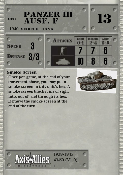 Once per game at the end of your movement phase, you may put a smoke screen in this unit's hex. A smoke screen blocks line of sight into, out of and through its hex. Remove the smoke screen at the end of the turn.