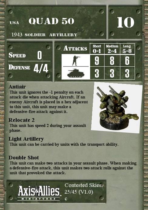 This unit ignores the -1 penalty on each attack die when attacking Aircraft. If an enemy Aircraft is placed in a hex adjacent to this unit, this unit may make a defensive-fire attack against it.