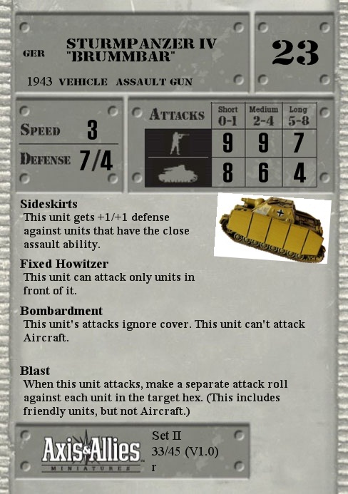 Note: As of booster set nine, there are eight units that have the Blast SA; the Germans have the SIG 33, Nebelwerfer 41, Sturmpanzer IV “Brummbar” and the Hummel, the US have the M12