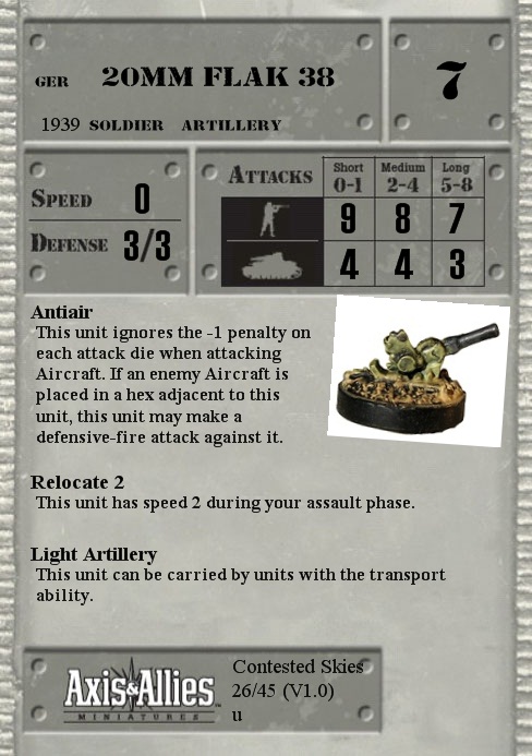 This unit ignores the -1 penalty on each attack die when attacking Aircraft. If an enemy Aircraft is placed in a hex adjacent to this unit, this unit may make a defensive-fire attack against it.