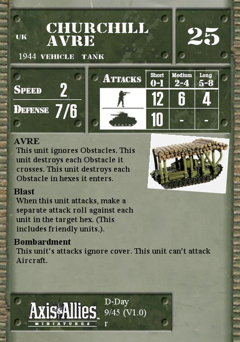 The AVRE vehicles were specially designed to destroy and/or easily cross any obstructions found on the beaches of Normandy. The Churchill AVRE immediately destroys any Obstacle it crosses and any Obstacle in a hex that it enters. Since it also ignores Obstacles, the AVRE is never adversely affected by Fortifications or Traps.