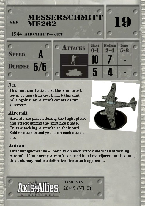 Aircraft are placed during the flight phase and attack during the airstrike phase. Units attacking Aircraft use their anti-Soldier attacks and get –1 on each attack die.