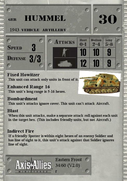 Note: As of booster set nine, there are eight units that have the Blast SA; the Germans have the SIG 33, Nebelwerfer 41, Sturmpanzer IV “Brummbar” and the Hummel, the US have the M12