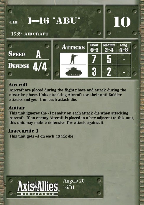 Aircraft are placed during the flight phase and attack during the airstrike phase. Units attacking Aircraft use their anti-Soldier attacks and get –1 on each attack die.