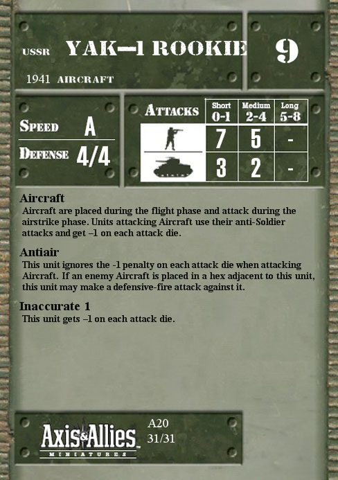Aircraft are placed during the flight phase and attack during the airstrike phase. Units attacking Aircraft use their anti-Soldier attacks and get –1 on each attack die.