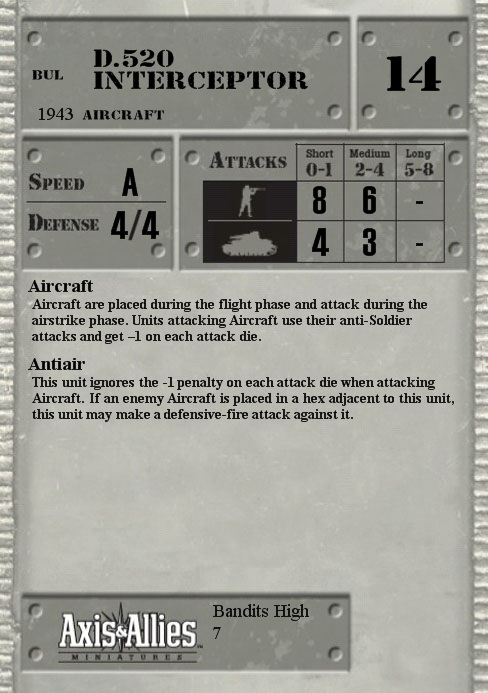 Aircraft are placed during the flight phase and attack during the airstrike phase. Units attacking Aircraft use their anti-Soldier attacks and get –1 on each attack die.