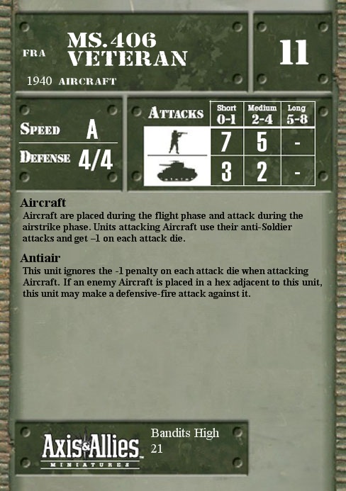 Aircraft are placed during the flight phase and attack during the airstrike phase. Units attacking Aircraft use their anti-Soldier attacks and get –1 on each attack die.