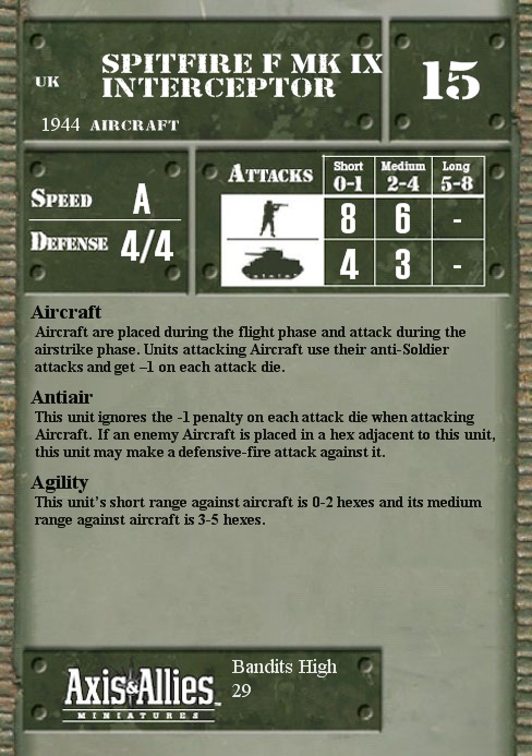Aircraft are placed during the flight phase and attack during the airstrike phase. Units attacking Aircraft use their anti-Soldier attacks and get –1 on each attack die.