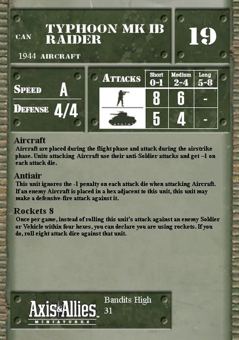 Aircraft are placed during the flight phase and attack during the airstrike phase. Units attacking Aircraft use their anti-Soldier attacks and get –1 on each attack die.
